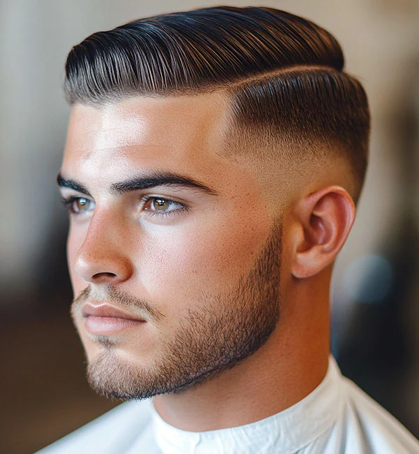 Modern, temiz ve dengeli bir görünüm sağlar. Hem gündelik yaşama hem şık kutlamalara uygundur. Kısa sakal yüz hatlarını vurgularken saçtaki yumuşak fade geçişiyle uygun bir kombin sağlanır. Doğal, düzenli ve tam fotoğraflık!